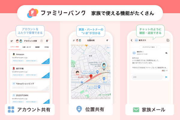 「共有口座」や「家族カード」でのお金の管理をはじめ、位置やアカウント、メール、ToDo、カレンダーなど、2人でシェアしている多くの情報を最適な形でシェアすることができます。