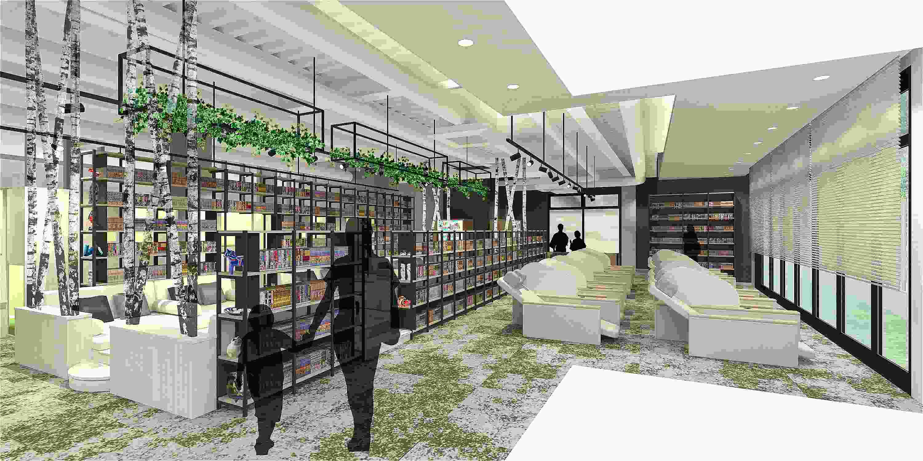 休憩エリアでは8,500冊以上のコミックが読み放題。リクライニングエリアでゆったり休憩したり、コワーキングスペースで仕事や勉強をしたり。
