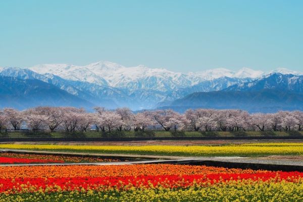 翌日は冠雪の北アルプスを背景に、桜・菜の花・チューリップが織りなす華やかな景色「あさひ舟川・四重奏」に心奪われます。高田城址公園では約4,000本の桜を鑑賞。花がこぼれ、心まで満開になる富山・新潟の旅へお出かけください。