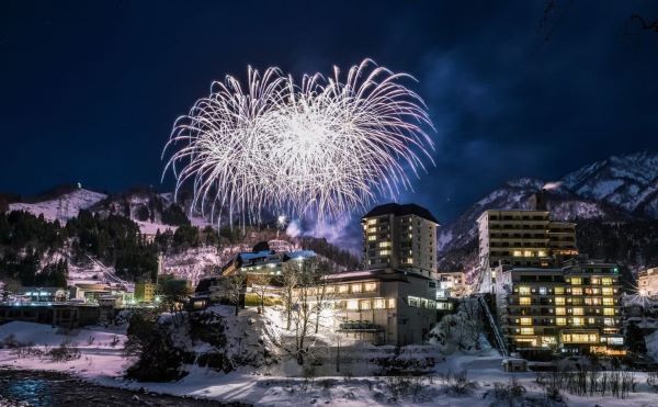 ダイニング列車「一万三千尺物語」に乗車し、立山連峰と富山湾を望む特別な旅が始まります。車内では鮨職人による握りたての富山湾鮨を味わい、宇奈月温泉では「宇奈月温泉冬物語 雪上花火大会」を鑑賞。冬の澄んだ夜空を彩る花火をお楽しみください。