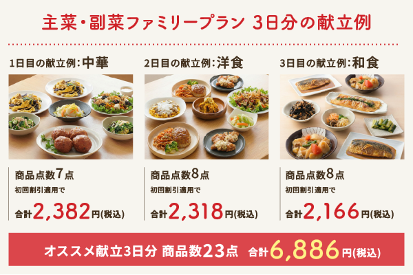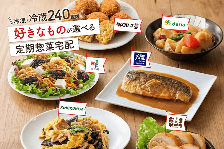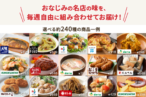 高品質スーパーや専門店の人気惣菜をまとめて店頭価格でお届けする定期宅配サービスです。240種類の美味しく健康的な惣菜を組合せ、週1回3食分の夕食を管理栄養士がご提案します。各週のご提案献立をお客様にご注文カートでご確認いただき、お届け3日前までお客様に自由に商品変更やキャンセルを行っていただきます。
